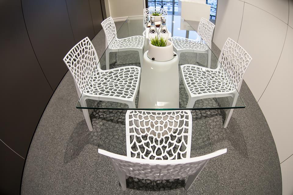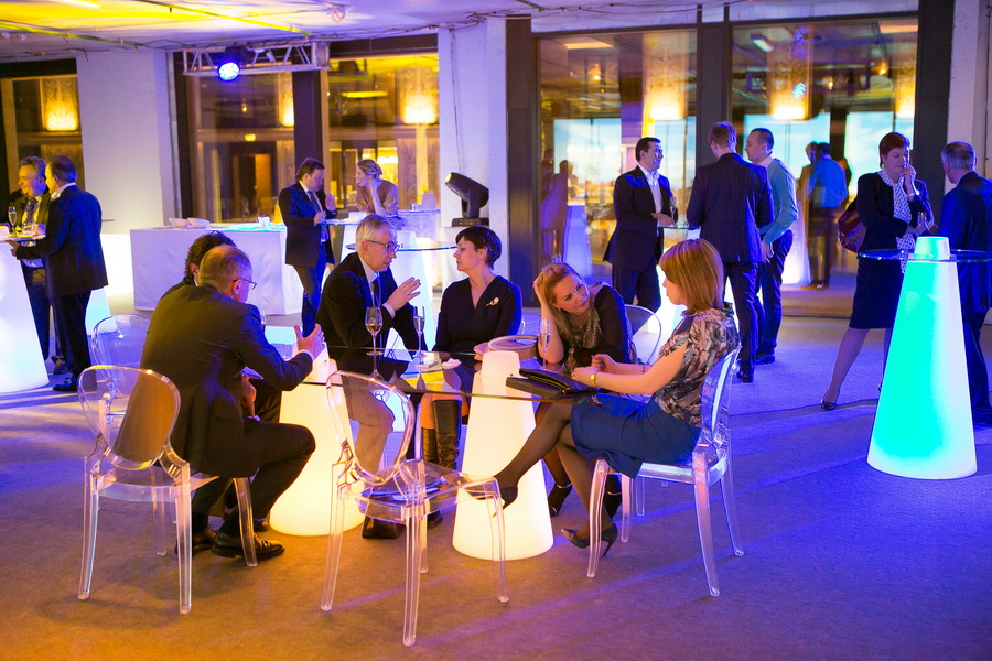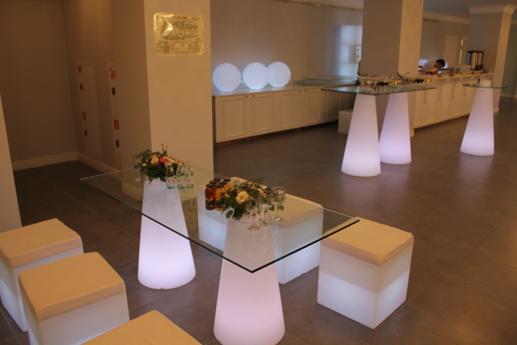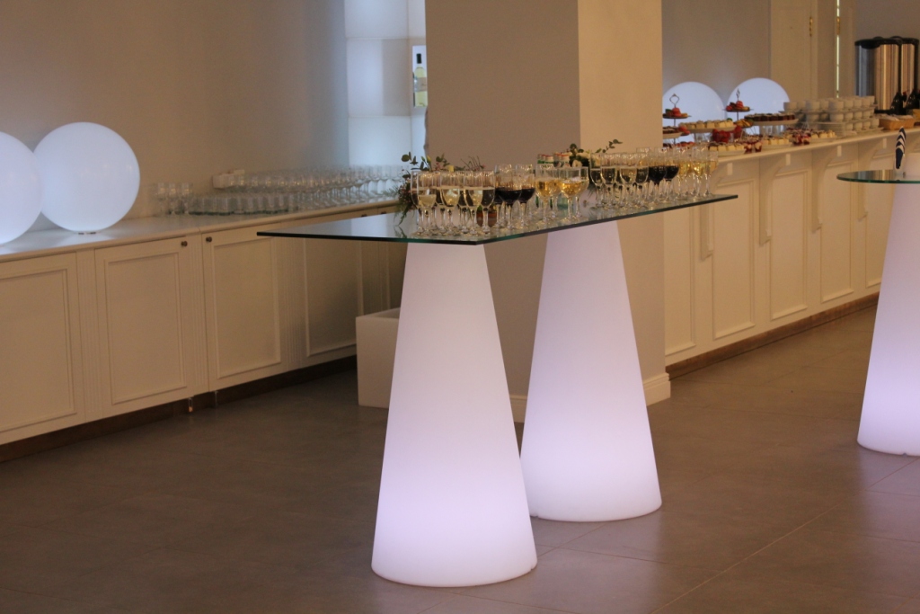 Стол с подсветкой на двух конусных опорах PEAK со столешницей из закаленного стекла прямоугольной формы.