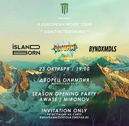 САНКТ-ПЕТЕРБУРГ. Дворец Олимпия. 23 октября «Monster Energy» – всемирно известный энергетический напиток, представил три новых фильма о сноубординге: Island Born, Dayumm! и Vacation Forever. Мероприятие посетили звезды сноубординга первой величины: олимпийский чемпион по слоуп стайлу 2014 года Сейдж Коценбург (Sage Kotsenburg); легенда уличного катания Халлдор Хельгасон (Halldor Helgason), а также бэккантри-райдеры и короли вечеринок Тор Лундстром (Tor Lundstrom) и Кевин Бэкстром (Kevin Backstrom). Компания OTIDO GROUP выступила техническим партнером события и предоставила на мероприятие уникальную светящуюся мебель White Project, брендированную согласно требованиям «Monster Energy»