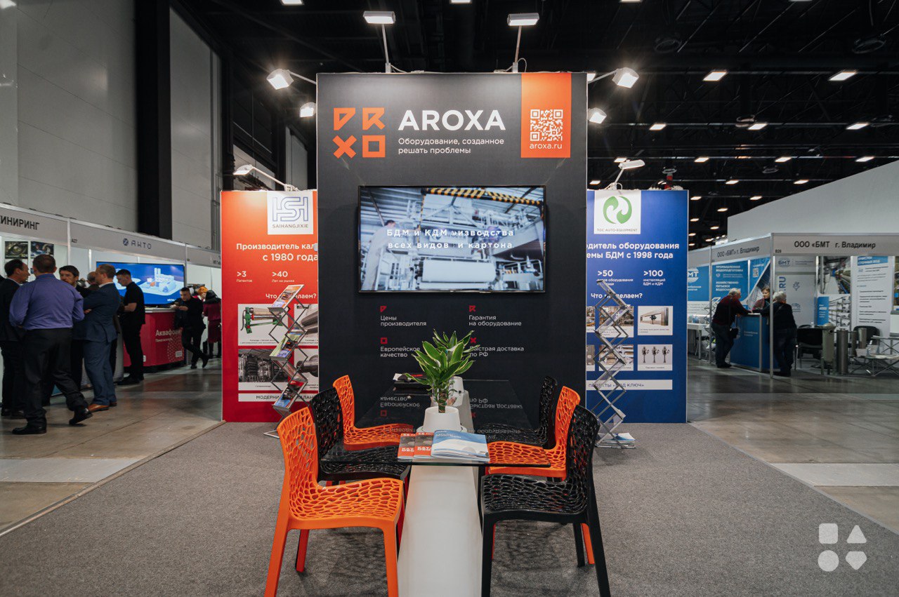 Застройка выставочных стендов для брендов AROXA и FJLIME по технологии beMatrix с тканевым декоративным заполнением.