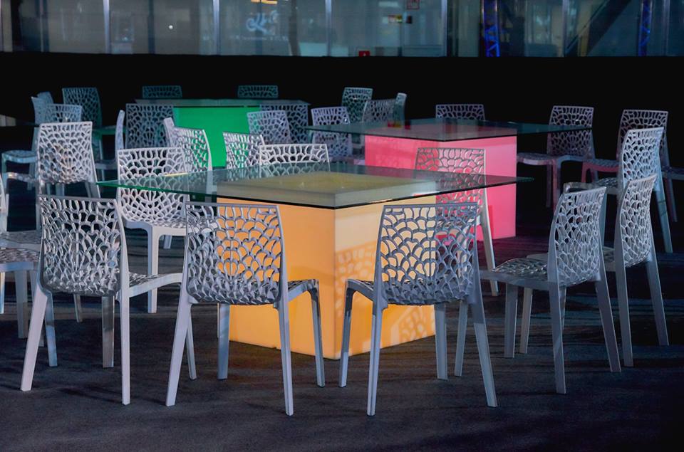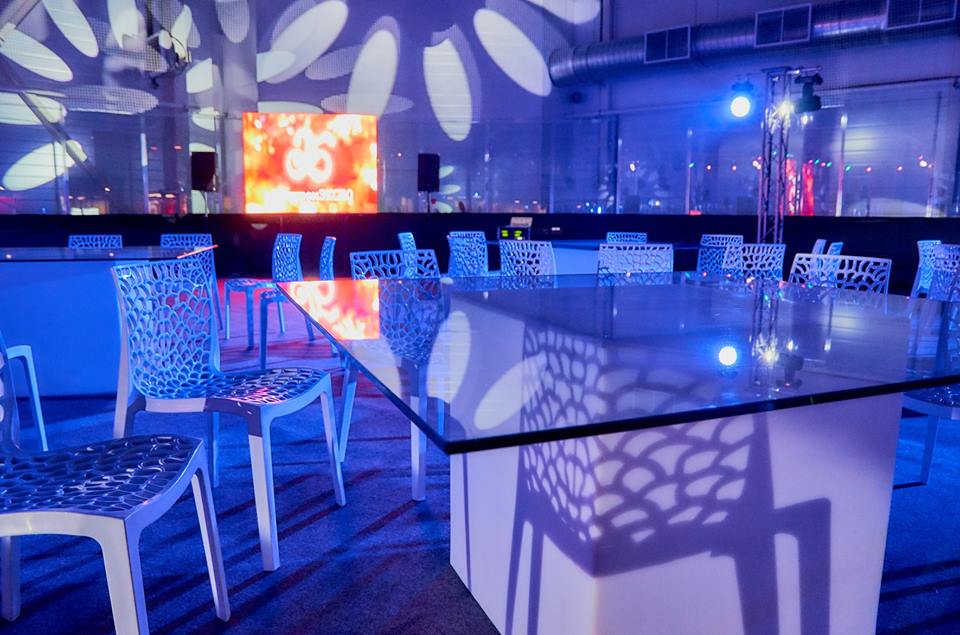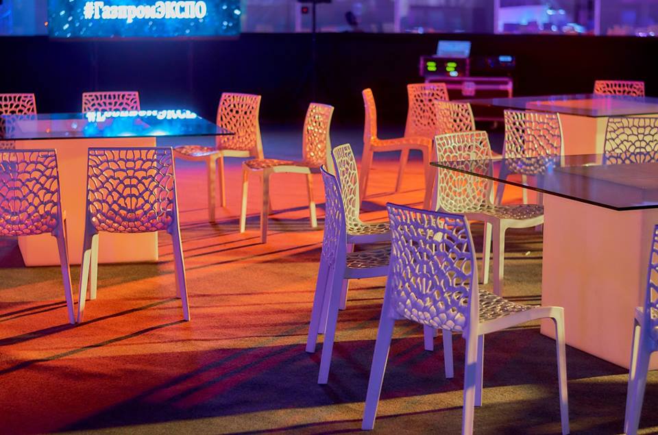 САНКТ-ПЕТЕРБУРГ. ШАНС АРЕНА. В праздничные дни для закрытого мероприятия в спортивном комплексе "Шанс Арена" команда White Project организовала пространство с помощью дизайнерской мебели. QUADRO - столы кубической формы GROOVER WHITE - cтулья для гостей SNACK BAR -стойки на welcome CUBO - кубы разного размера Основной задумкой, подчеркивающей концепцию события стала LED-подсветка всей мебели.